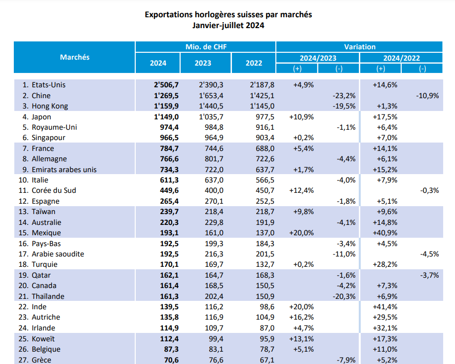 Satışlarda artış sınırlı olmasına karşın, İsviçre dünyanın bir numaralı saat ihracatçısı konumunu koruyor. 2023 yılında 16,9 milyon adet kol saati ihraç eden İsviçreli üreticiler 25,5 milyar frank (30 milyar dolar) döviz girdisi sağladı. Saat başına ortalama ihracat fiyatı 1.775 dolar olurken, lüks saatler gümrük ve diğer vergiler sonrasında fiyata yüzde 40 seviyelerinde son satıcının da kârı eklenerek satılıyor.