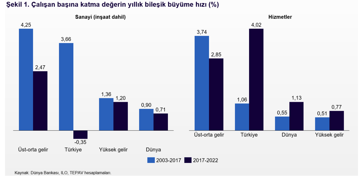 2017-2022 döneminde Türkiye'de sanayi verimliliği azalırken hizmet verimliliği kendi gelir grubu ortalamasının bile üstünde arttı. Yüksek gelirli ekonomilerde ise sanayi verimliliği hizmetler verimliliğinden daha hızlı artıyor.