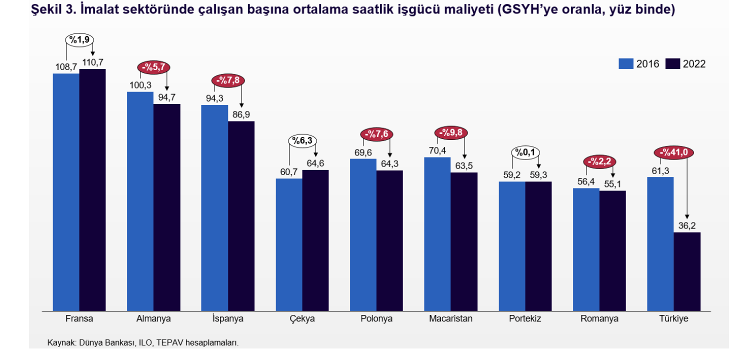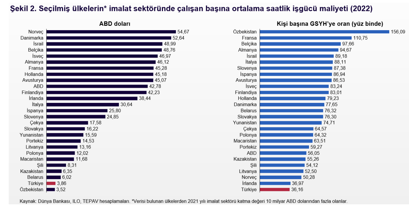 Türkiye 2021 yılı imalat sektörü katma değeri 10 milyar doların üzerindeki ülkeler arasında ortalama saatlik işgücü maliyeti bakımından sondan ikinci sırada yer alıyor. Türkiye Ekonomi Politikaları Araştırma Vakfı (TEPAV) Kalkınma Programı Direktörü Ekrem Cunedioğlu’nun hazırladığı “İmalat Sektörü ve İyi İşler” başlıklı bilgi notu Türkiye’de imalat sanayisinde işçilik maliyetlerinin yüksek olduğu savını boşa çıkartırken verimlilik konusunda da alınacak hayli yol olduğunu gösteriyor. Bilgi notundaki ilginç tespitlerde biri de Türkiye’de 2020-2022 döneminde inşaat sektörü dahil sanayi sektöründe çalışan başına katma değerin tüm dünyanın tersine düşmüş olması. Cunedioğlu bilgi notunda şu görüşleri paylaşıyor: