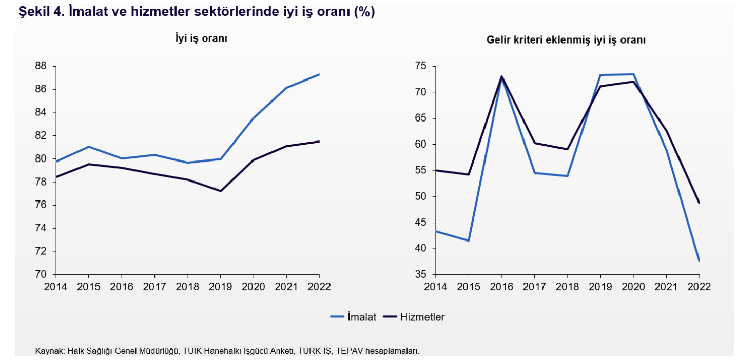 TOBB ETÜ Sosyal Politikalar Merkezi, tarım dışında, kayıtlı ve zamana bağlı eksik olmayan istihdamı eğreti olmayan istihdam olarak tanımlıyor. Bu tanımdan hareketle imalat ve hizmetler sektörlerinde kayıtlı ve zamana bağlı eksik olmayan istihdamın sektörlerin toplam istihdamı içindeki payını iyi iş oranı olarak varsayabiliriz. Şekil 4’te görüleceği gibi 2019’dan sonra özellikle kayıt dışı istihdamdaki azalmaya bağlı olarak her iki sektördeki iyi iş oranı artıyor. Ancak bu tanıma bir gelir kriteri de eklenebilir. Nitekim iyi bir işin çalışana yeterli ücreti sunmasını da bekleriz. Yeterli ücreti belirlemek için Halk Sağlığı Genel Müdürlüğü’nün yayımladığı Türkiye Beslenme Rehberi 2022 çalışmasında 30-39 yaş grubunda ve orta aktif fiziksel aktivite yoğunluğundaki medyan (ortanca) erkeği referans çalışan olarak varsaydık. Bu referans çalışanın günlük kalori gereksinimi 2452 kkal. TÜRK-İŞ’in hesapladığı açlık sınırını, 4 kişilik hane için varsaydıkları toplam günlük enerji gereksinimi olan 10600 kkal’e bölüp 2452 ile çarptığımızda referans çalışanımız için bir dengeli beslenme eşiği belirlemiş oluyoruz. Bu eşiğin 4 katının yeterli ücret eşiği olduğunu varsayıp iyi iş tanımına bu kriteri eklediğimizde iyi iş oranı sonuçları tamamen değişiyor. 2022 itibarıyla Türkiye’deki tarım dışı işlerin sadece yüzde 44,7’si gelir kriterimizi sağlayan iyi iş tanımını sağlıyor. Yine Şekil 4’te görüleceği üzere gelir kriteri eklenmiş iyi iş oranı hem hizmetler hem de imalat sektörlerinde 2020’den sonra hızlı şekilde azalıyor. Hatta imalat sektöründeki iyi iş oranı azalmasının hizmetlerden daha fazla olması dikkat çekiyor.