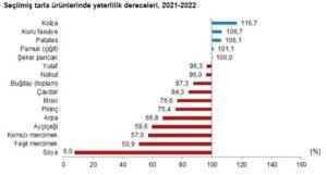 Meyveler ve içecek bitkilerinde 2021-2022 piyasa döneminde en yüksek yeterlilik derecesi yüzde 560,9 ile fındıkta gerçekleşti. Turunçgiller grubunda yer alan meyvelerin tamamının kendine yeterli olduğu görüldü. Toplam çay arzının büyük bir kısmı kendi üretimimizden karşılanmakta olup, çayın yeterlilik derecesi yüzde 97,9 oldu.