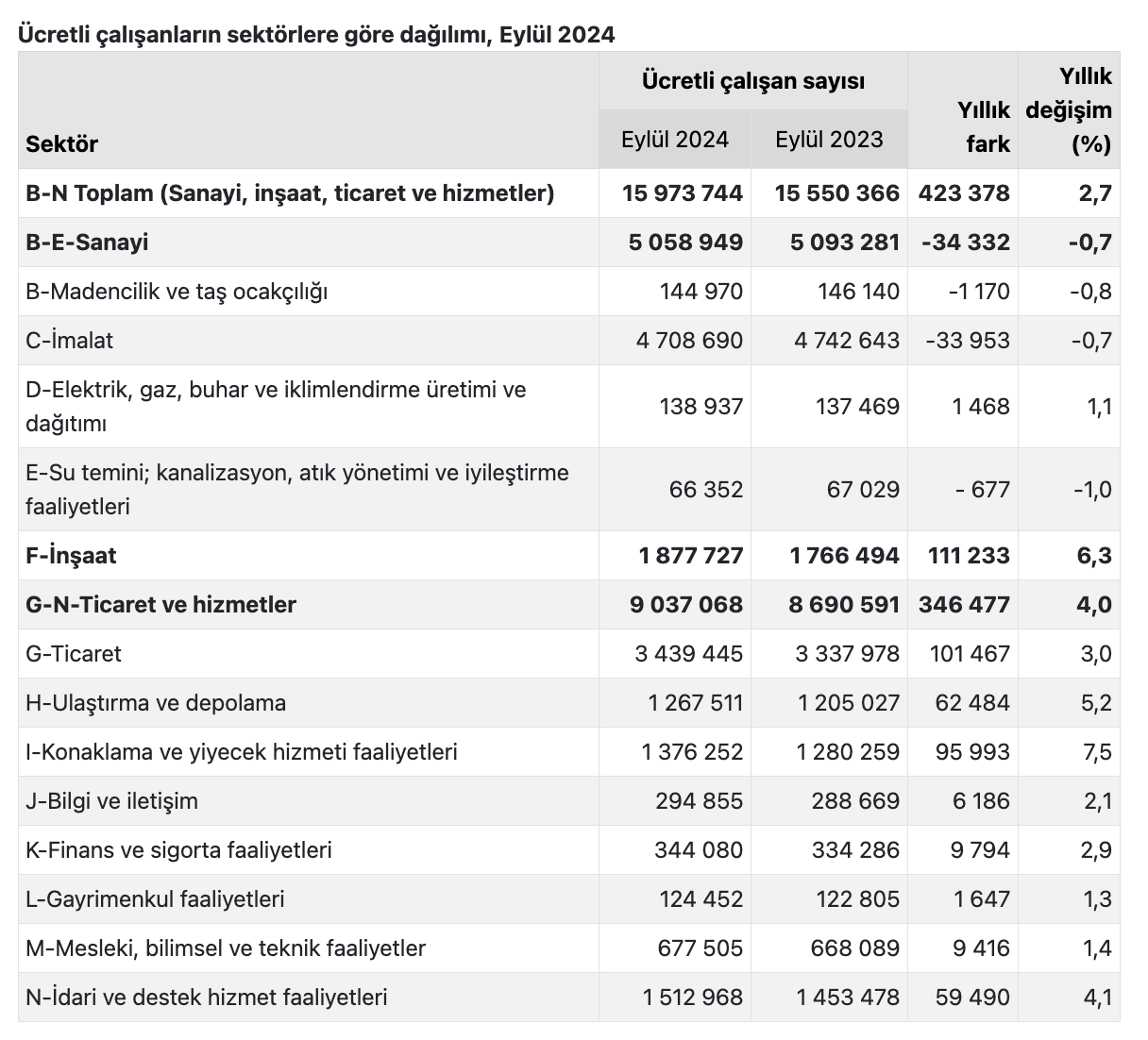 Ücretli çalışan sayısı 2024 Eylül'ünde geçen yılın aynı ayına göre 423 bin 378 kişi arttı. Ancak son bir yılda sanayide çalışan 34 bin 332 SGK'lı işini kaybetti. İmalat sanayinde işsiz kalan SGK'lıların sayısı da 33 bin 953 oldu.