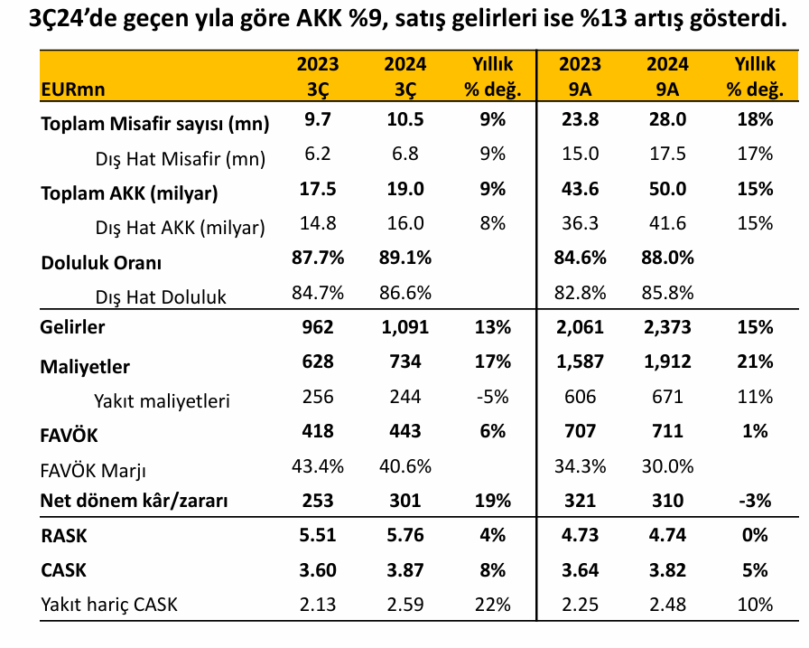 Üçüncü çeyrek sonuçlarını açıklayan Pegasus, tüm gelir kalemlerinde geçen yıla göre euro bazında reel büyüme sağladı. Pegasus Hava Yolları üçüncü çeyrek itibarıyla piyasa beklentilerinin üzerinde bir performans sergileyerek güçlü finansal sonuçlar açıkladı. Şirket 443 milyon euro ile piyasa beklentisinin yüzde 4,2 üzerinde faiz, amortisman ve vergi öncesi kârlılık (FAVÖK) elde ederken net kârı 301 milyon euro ile ikinci çeyreğe göre yüzde 19 yukarıda gerçekleşti ve tüm gelir kalemlerinde geçen yılın aynı dönemine kıyasla euro bazında reel büyüme sağladı.