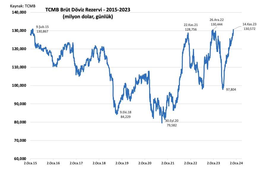 9 Şubat 2015’te 130 milyar 867 milyon dolar olan brüt döviz rezervlerinde bugüne kadar bu rakama hiç bu kadar çok yaklaşılmamıştı. Tüm zamanlar rekoru ise 28 Aralık 2013 tarihinde 138 milyar 140 milyon dolar olarak gerçekleşmişti.
