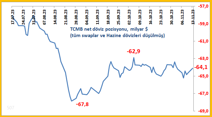 Brüt döviz rezervlerindeki rekora rağmen IMF’den 2021’de gelen 6,3 milyar dolarlık özel çekme hakkı (SDR), swap, borçlar vs. çıkarıldığında net döviz rezervi hâlâ yatay bir seyir izliyor.