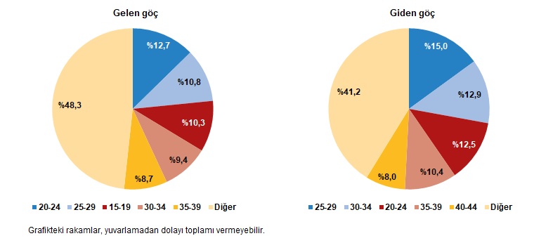 Türkiye’ye 2023 yılında göç edenlerin yaş grubu incelendiğinde, en fazla göç edenlerin yüzde 12,7 ile 20-24 yaş grubunda olduğu görüldü. Bu yaş grubunu yüzde 10,8 ile 25-29 ve yüzde 10,3 ile 15-19 yaş grubu izledi. Türkiye’den göç eden nüfusun yaş gruplarına bakıldığında, en fazla göç edenlerin yüzde 15 ile 25-29 yaş grubunda olduğu görüldü. Bu yaş grubunu yüzde 12,9 ile 30-34 ve yüzde 12,5 ile 20-24 yaş grubu izledi.