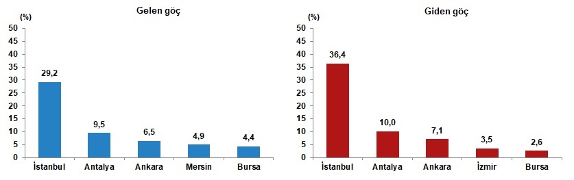 Türkiye’den göç eden nüfusun illere göre dağılımına bakıldığında ise yüzde 36,4 ile İstanbul’un en fazla göç veren il olduğu görüldü. İstanbul’u yüzde 10 ile Antalya, yüzde 7,1 ile Ankara, yüzde 3,5 ile İzmir ve yüzde 2,6 ile Bursa izledi.
