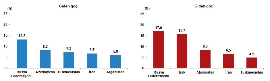 Türkiye’den göç eden yabancı uyruklu nüfus içinde ilk sırayı yüzde 17 ile Rusya Federasyonu vatandaşları aldı. Rusya Federasyonu’nu, yüzde 15,7 ile Irak, yüzde 8,3 ile Afganistan, yüzde 6,5 ile İran ve yüzde 4,9 ile Türkmenistan vatandaşları takip etti.