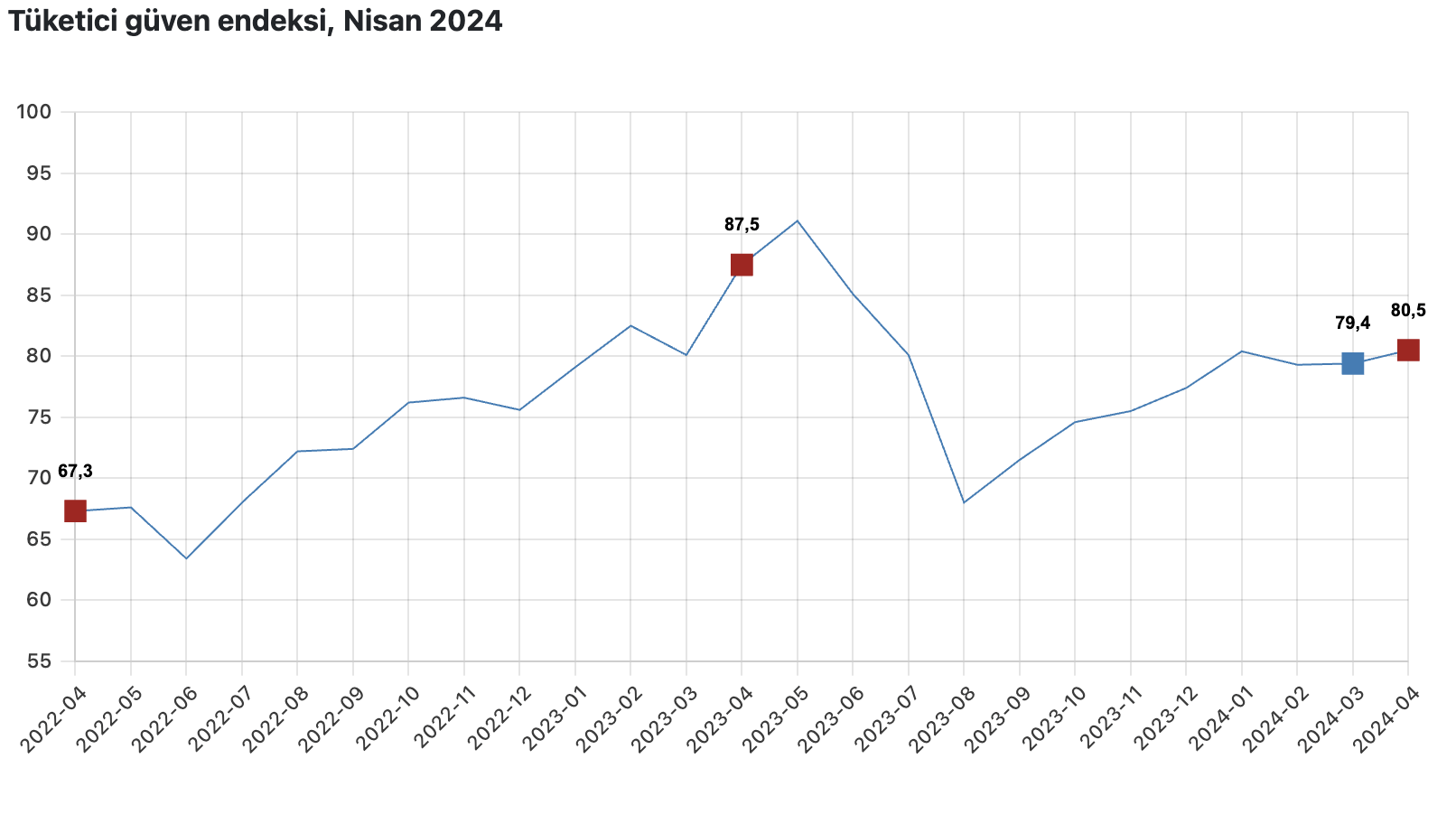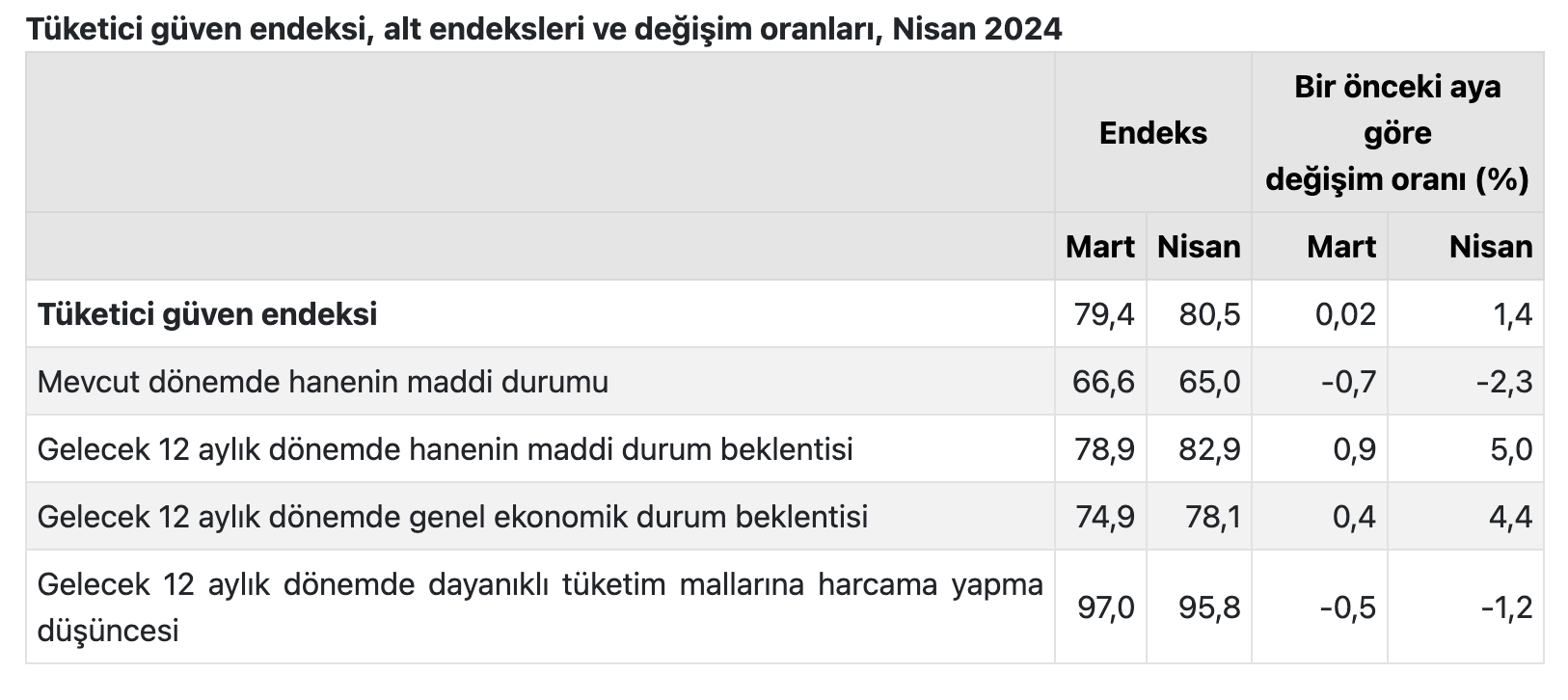 Tüketici güven endeksi nisanda arttı ama "Mevcut dönemde hanenin maddi durumu" alt endeksi geriledi. Türkiye İstatistik Kurumu ve Türkiye Cumhuriyet Merkez Bankası işbirliği ile yürütülen tüketici eğilim anketi sonuçlarından hesaplanan tüketici güven endeksi vatandaşın bugünkü ekonomik duruma bakışı ve yarınla ilgili beklentileri bakımından ilginç sonuçlar ortaya çıkardı. Nisan 2024 sonuçlarına göre martta 79,4 olan tüketici güven endeksi nisan ayında yüzde 1,4 oranında artarak 80,5 oldu.