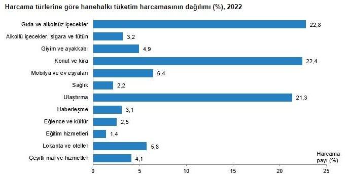 Hanehalkı büyüklüğüne göre tüketim harcamalarının 2022 yılındaki dağılımına bakıldığında; tek kişilik hanehalkları, konut ve kira harcamalarına yüzde 27,7, ulaştırma harcamalarına yüzde 20,4 ve gıda ve alkolsüz içecek harcamalarına yüzde 16,8 pay ayırdı. Hanehalkı büyüklüğü 7 ve daha fazla kişi olan hanehalkları, gıda ve alkolsüz içecek harcamalarına yüzde 35,9, konut ve kira harcamalarına yüzde 18,8 ve ulaştırma harcamalarına yüzde 14,4 pay ayırdı.