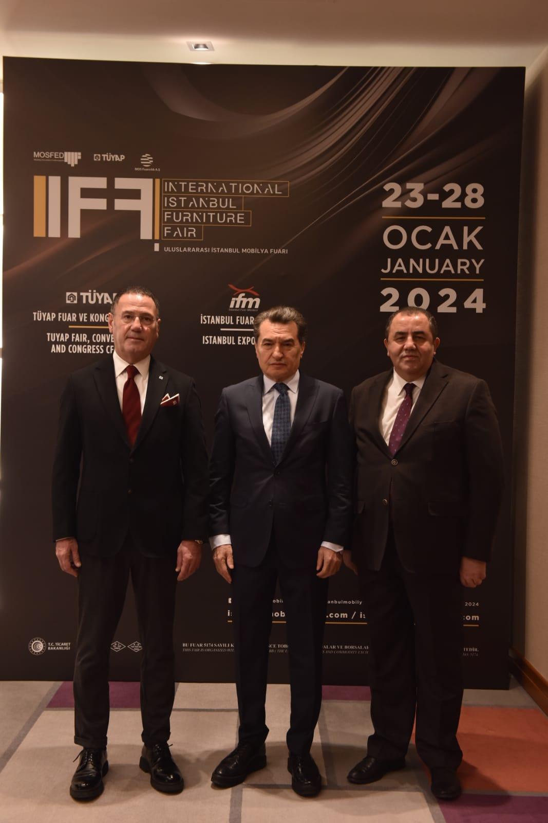 (Soldan sağa) Tüyap Fuarlar Yapım AŞ Genel Müdürü İlhan Ersözlü, MOSFED Ahmet Güleç ve MOBSAD Başkanı Nuri Gürcan 23-28 Ocak’ta düzenlenecek Uluslararası İstanbul Mobilya Fuarı-IIFF 2024 öncesinde basın toplantısı yaparak fuar hakkında bilgi verdi.