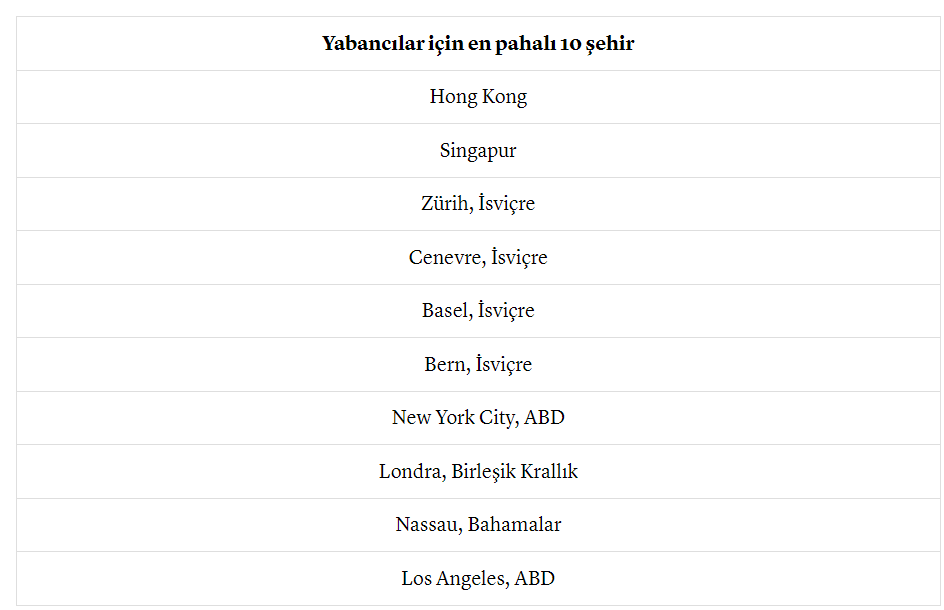 Yapılan anket, incelenen 226 şehir içinde konut, ulaşım, gıda, giyim, ev eşyası ve eğlence fiyatları da dahil olmak üzere 200'den fazla kalemin maliyetini karşılaştırıyor. Mercer, Yaşayan Şehirlerin Maliyeti 2024 sıralamasının sonuçlarını paylaştı. Rapora göre yabancı çalışanlar için en pahalı şehirleri arasında Hong Kong ilk sırada. Onu Singapur ve Zürih takip ederken listede İsviçre’den dört şehir olması dikkat çekiyor. CNBC Make It’in paylaştığı sıralamaya göre ilk beşte önceki yıla göre hiçbir değişiklik yok, ancak Londra’nın dokuz sıra birden yükselerek 17’inci sıradan 8’inci sıraya çıkması dikkat çekti.