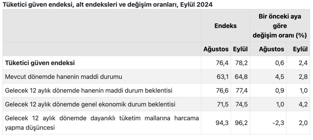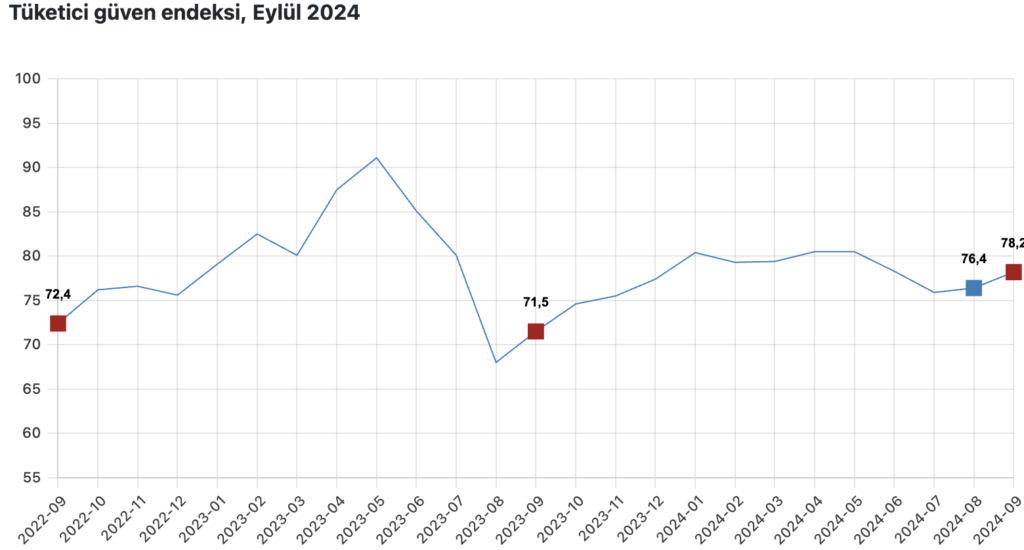 Temmuz ve ağustosta baz etkisiyle önemli oranda düşen yıllık enflasyon tüketiciyi de iyimser yaptı. Tüketici güven endeksi, eylülde önceki aya göre yüzde 2,4 artışla 78,2 seviyesine yükseldi. Endeks mayıstan bu yana en yüksek düzeye çıktı.