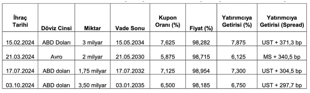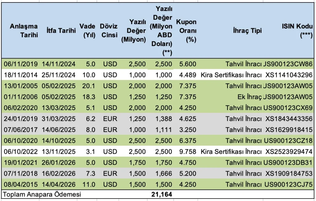 2024 Ekim –2026 Nisan döneminde yapılacak borç geri ödemeleri içinde vadesi gelecek olan 10 adet tahvil bulunuyor. Ancak bunların ikisi kira sertifikası ve diğer ikisi de EUR cinsinden olduğu için ABD doları cinsinden yapılan değişim işlemine konu olmuyor. Dolayısıyla değişime sadece aşağıdaki yeşil ile işaretli altı adet USD cinsi tahvil dahil edildi.