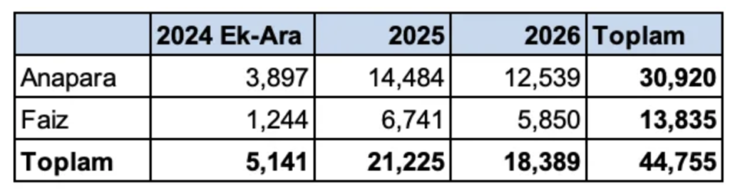 Hazinenin refinansman riskinin boyutunu anlamak için 2024–2026 dönemi dış borç ödeme takvimine bakmak gerekiyor. Ve burada toplam 44,9 milyar dolar dış borç ödemesi olduğunu görüyoruz.