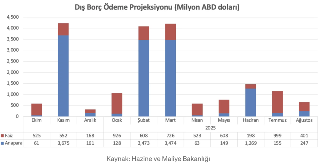 Bunun 2025 yılı Ağustos ayına kadar açıklanmış olan aylık dağılımına baktığımızda ise sadece Kasım 2024, Şubat ve Mart 2025 aylarındaki toplam dış borç ödemesinin 12,5 milyar dolar olduğu dikkat çekiyor. Dolayısıyla borç ödeme takvimi ve yüklü borç itfaları Hazinenin neden tahvil değişimine gittiğini açıklıyor.