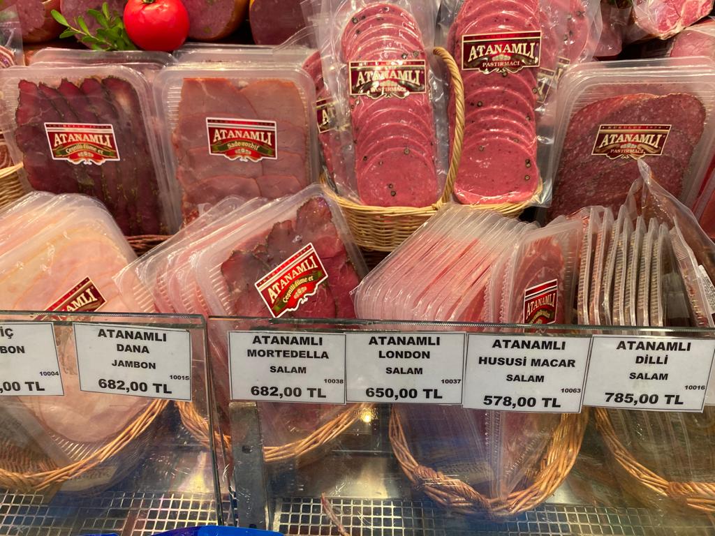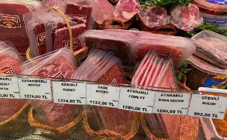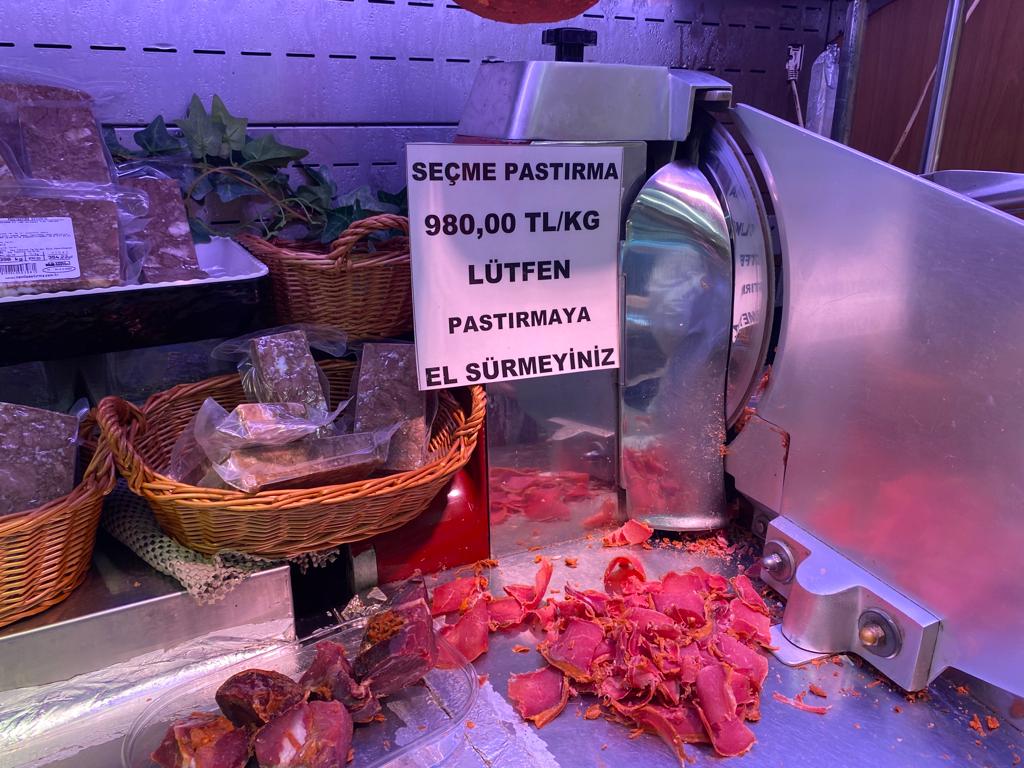 Eminönü’nün kahvaltılık ürünlerinde uğrak noktalarının başında gelen Namlı’ya girdiğimizde bizi karşılayan “Seçme pastırma 980 lira, lütfen el sürmeyiniz” yazısını görünce “Bana pastırma beyefendi diyeceksiniz” cümlesi kaçıveriyor ağzımızdan. Dikkatimizi çeken ilk şey bir zamanlar kasada uzun kuyrukların olduğu dükkanda hiç kimsenin olmaması. İçeri girince girişteki pastırma fiyatının ne kadar düşük kaldığını şaşkınlıkla görüyoruz. Bir zamanlar kahvaltı sofralarının vazgeçilmezleri arasında gelen pastırmayı kokuyor diye çemensiz almak isterseniz en az 1,500 lirayı gözden çıkarmanız gerekiyor. Pastırmanın arkadaşları da o kadar olmasa da haşmetli duruşlarını etiketlerine yansıtmış, adeta “Alamazsın beni” diye bıyık altından gülüyor. Rozbif 1,300 lirayı, füme et 1,200 lirayı aşarken, kavurmanın kilosu bin, salam 650, sucuk 800 liralarda dolanıyor.