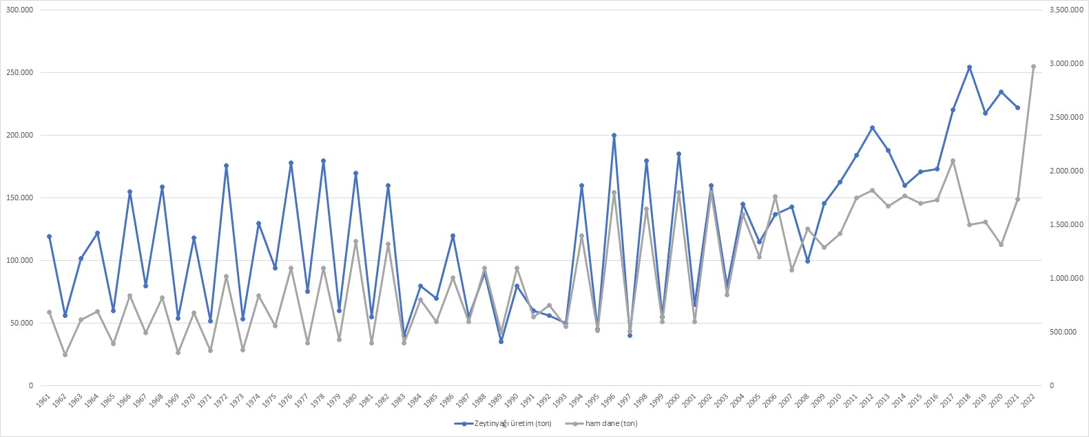 Birleşmiş Milletler’ bağlı Gıda ve Tarım Örgütü’ne (FA) iletilen UZZK’nın verilerine göre Türkiye’de ham dane üretimine paralel şekilde artan zeytinyağı üretimi 2020 yılından sonra gerçek anlamda “patlama” yapmış. Ancak bu etkileyeci artışın nedeni henüz belli değil. Belki de 2023 ve 2024 verilerinin FAO’ya iletilmesiyle dane zeytin ile zenytiyağı üretimindeki paralelliğin tekrar yakalandığını göreceğiz.