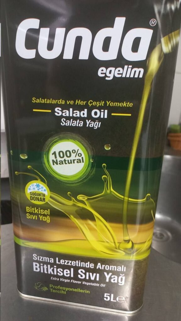 Bir kafenin hem ucuz hem de zeytinyağına benzediği için kullandığı ve 10Haber’in gördüğü bu ürünün teneke kutusunun üstünde “Sızma Lezzetinde Aromalı Bitkisel Yağ” ve “Salatalarda ve Her Çeşit Yemekte Salad Oil- Salata Yağı” ibareleri bulunuyor. Zeytinyağına özgü “Sızma” sözcüğünün de bulunduğu teneke kutunun üzerinde zeytinyağını çağrıştıran bir görüntü de var. Ürünün ambalajında “Profesyonellerin Tercihi” sözcüğüne de yer verilerek ucuza kaçan otel, restoran, kafe ve yemek şirketlerinin hedeflendiği itiraf ediliyor. İncelenen ürünlerden birinin markası olarak zeytini ve zeytinyağı ile tanınan Ayvalık’tan esinlenerek “Cunda egelim” seçilmiş. Tüketicinin bunu görünce market rafında gördüğü ürünün çok dikkat etmezse zeytinyağı olmadığını fark etmesi kolay değil.