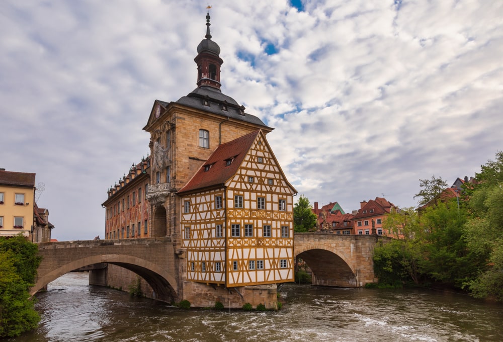 Nehrin üzerinde, yapay bir adanın üzerinde inşa edildiği için iki köprüyle ulaşılan bu ünlü bina, Almanya’da bulabileceğiniz en eşsiz belediye binalarından biri hatta büyük olasılıkla Bamberg’in en çok fotoğrafı çekilen yapısı.