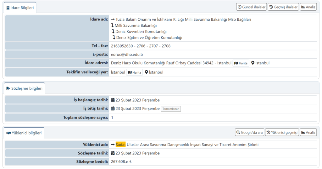 Milli Savunma Bakanlığı’na bağlı Deniz Kuvvetleri Komutanlığı’nın Tuzla Bakım Onarım ve İstihkam Komutanlığı’ndaki “75 Metre Atış Poligonunun Mermi Sekme Önleyici Perde Yenilenmesi Yapım İşi” SADAT şirketine verildi.