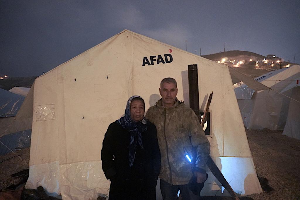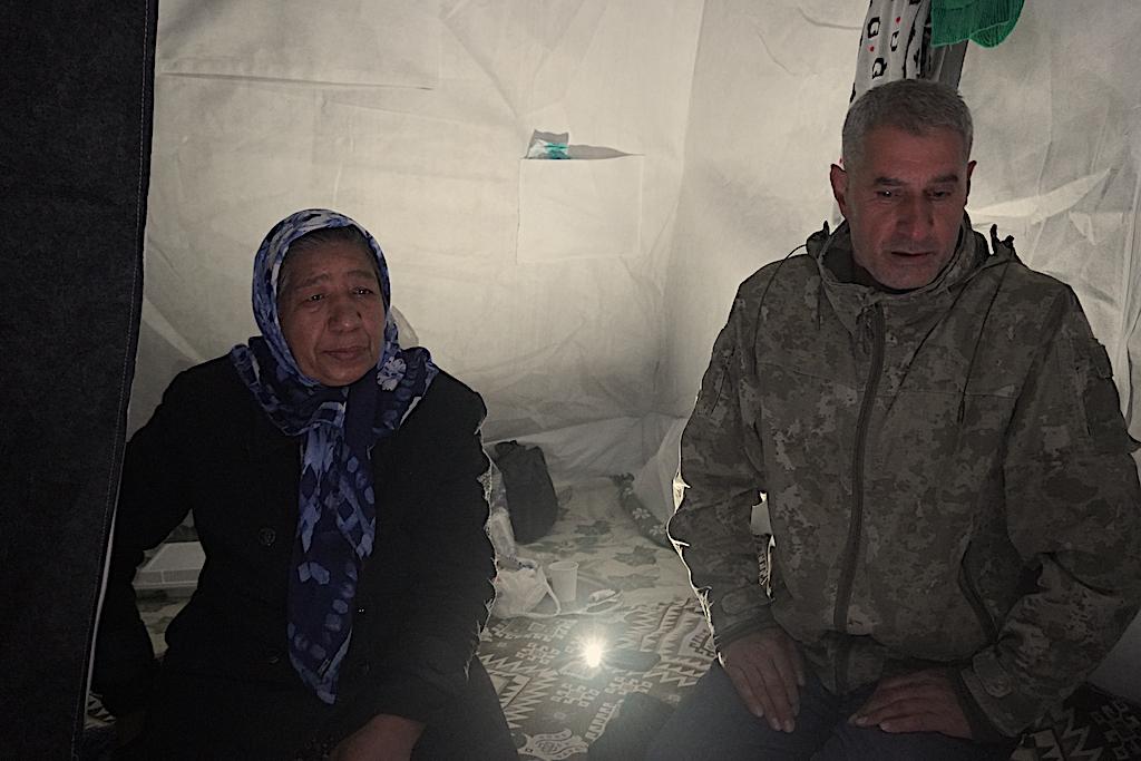 Uğur Gezer’in annesi Havva Gezer ve dayısı Ali Haydar Gezer kaldıkları çadırının önünde.