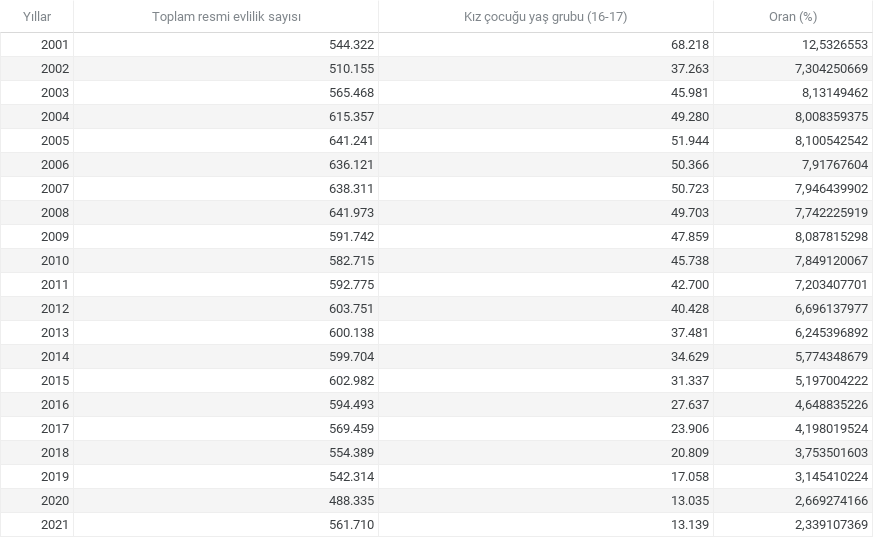 2001 – 2021 TÜİK toplam resmi evlilik, kız çocuğu yaş grubu ve oranları