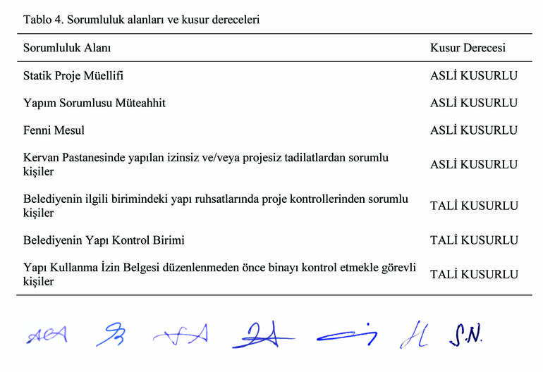 Dosyadaki belge ve fotoğraflardan, Kervan Pastanesi’nin servis amaçlı kullandığı asansör için +0.30 kotundaki tabliyede statik ve mimari projede bulunmayan bir boşluk açtığı ve havalandırma için perde duvarlarda boşluklar açtığı görülmektedir. Analizler sonucunda radye temelin donatı alanı açısından çoğunlukla yeterli olduğu ancak temel kirişlerinin donatı alanı açısından çoğunlukla yetersiz olduğu belirlenmiştir. Deprem nedeniyle yıkılan binanın projelendirme, yapım ve iş bitimi aşamalarındaki mevcut durumuna göre statik proje müellifi, yapım sorumlusu müteahhit, fenni mesul, Kervan Pastanesi’nde yapılan izinsiz ve/veya projesiz tadilatlardan sorumlu kişiler asli kusurlu, belediyenin ilgili birimindeki yapı ruhsatlarında proje kontrollerinden sorumlu kişiler, belediyenin yapı kontrol birimi ve yapı kullanma izin belgesi düzenlenmeden önce binayı kontrol etmekle görevli kişiler tali kusurludur.”