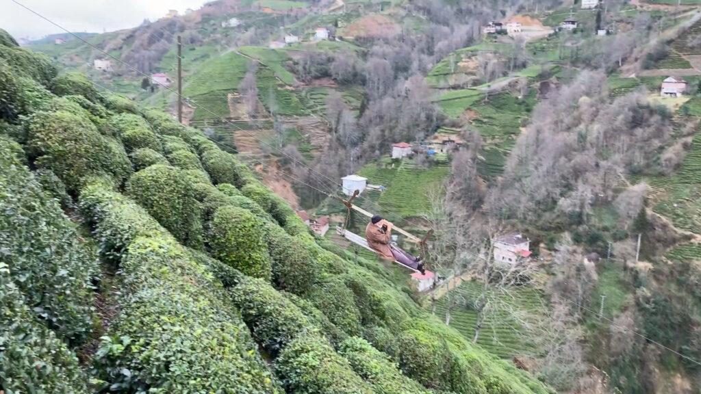 Rize'de yaşayan 90 yaşındaki Kasım Karaosman, sarp arazide yolu olmayan evine yük taşımak için kurduğu teleferik sistemiyle ulaşım sağlıyor. 75 metre yüksekten geçen tehlikeli yolculuğunun bitmesi için yol yapılmasını istiyor.