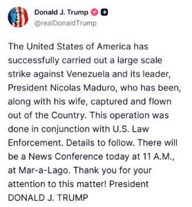 Bu açıklamasından dakikalar sonra The New York Times ile yaptığı kısa telefon röportajında Başkan Trump Maduro’yu yakalama operasyonunun başarılı olduğunu söyledi. Trump “Çok iyi bir planlama yapıldı, çok sayıda harika asker ve harika insanlar göreve katıldı. Bu mükemmel bir operasyondu” dedi.