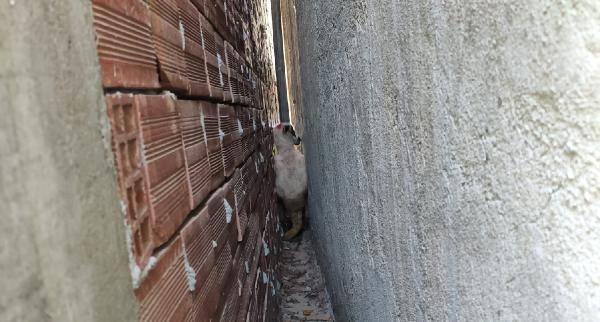 Sahibinin elinden kaçan kurbanlık koyun iki binanın arasına sıkıştı.