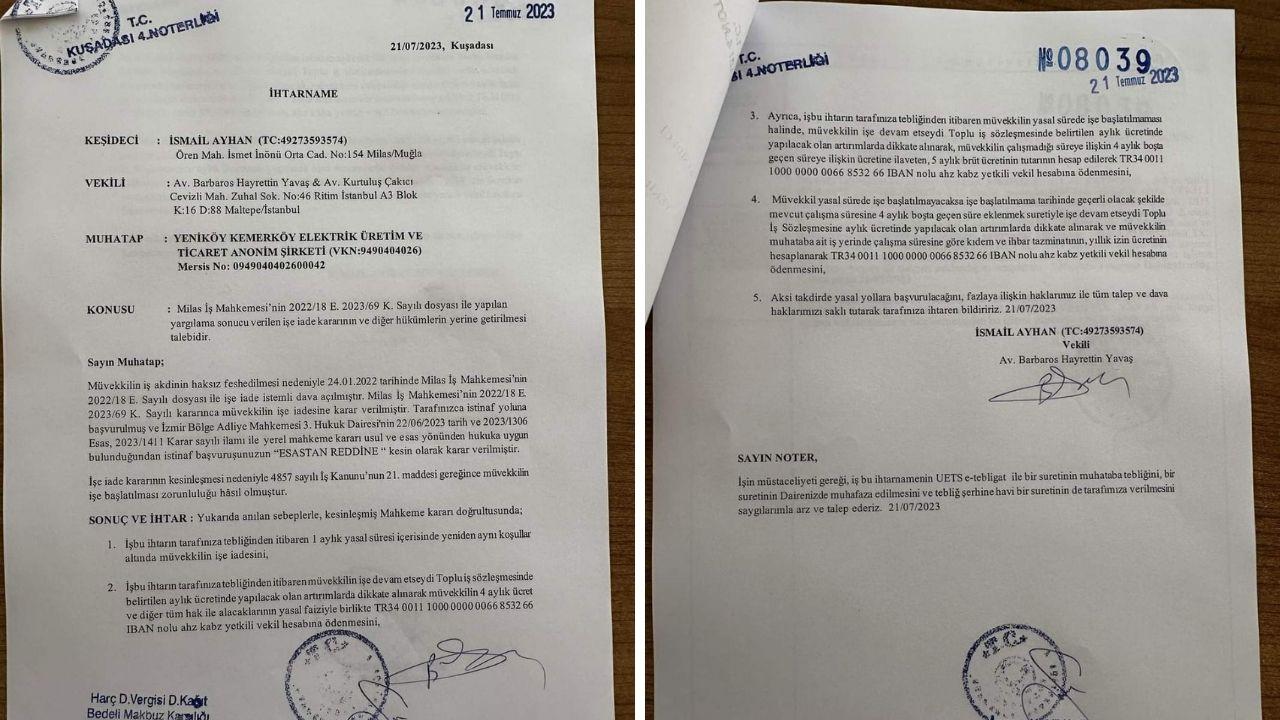 İsmail Ayhan’ın işe iade edilmesine dair mahkemenin verdiği karar.