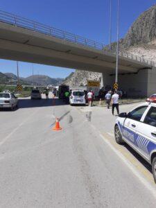 Yaşar Tiryaki (60) yönetimindeki minibüs, kavşakta Turgut Ceylan (47) yönetimindeki otomobille çarpıştı. Kontrolden çıkan minibüs köprü ayağına çarparak durabildi. Kazayı görenlerin ihbarıyla bölgeye polis ve sağlık ekipleri sevk edildi.