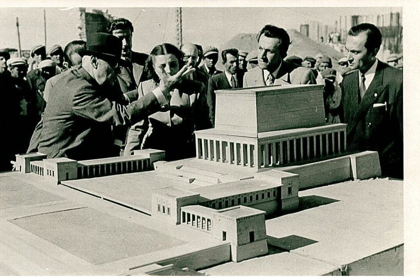 Dönemin Cumhurbaşkanı Celal Bayar, mimar Orhan Arda ve inşaatın kontrol mühendisleriyle inşaatı inceliyor. Kaynak: Ömer Arda arşivi.
