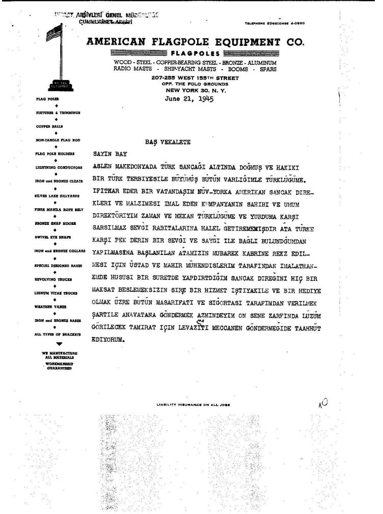 Takvim 21 Haziran 1945’i gösterdiğinde ABD’den başbakanlığa bir mektup gönderildi. Yazan, New York’ta bayrak direği ve malzemeleri imal eden bir şirketin sahibi olan Türk asıllı Nazmi Cemal’di.