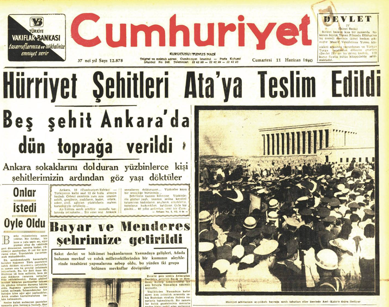 Anıtkabir’in yalnızca Atatürk için olduğu kuralı ihlal edilerek Demokrat Parti döneminde sokak gösterileri sırasında öldürüldükleri iddiasıyla beş gencin cenazesi ‘hürriyet şehitleri’ adıyla Anıtkabir bahçesine defnedildi.