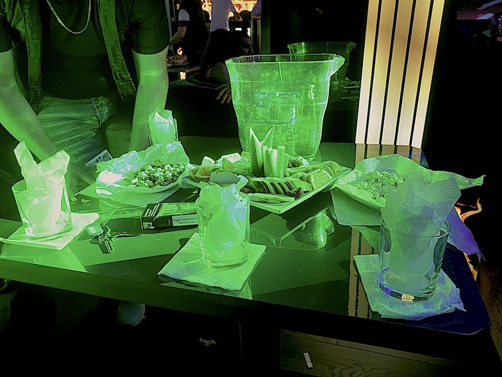 Yusuf, mekandaki selamlaşmasını bitirdikten sonra dans pistinin net gören bir masaya geçiyoruz. İçeriye girdiğimiz için 2 bin 500 TL’lik bir ödeme yapıyoruz. Bu ödemeden sonra bazı içkileri ve enerji içeceklerini içebiliyoruz. Masada patlamış mısır, meyve ve tuzlu fıstık bulunuyor.