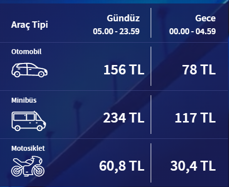 15 Temmuz Şehitler ve Fatih Sultan Mehmet köprülerinden otomobiller için geçiş ücreti 24 liradan 33 liraya yükseldi. Osmangazi Köprüsü’nden geçiş ücreti otomobiller için 399 TL’den 555 TL’ye çıktı. Yavuz Sultan Selim Köprüsü’nden geçiş ücreti otomobiller için 49 liradan 70 TL’ye yükseldi. 1915 Çanakkale Köprüsü’nden geçiş ücreti ise otomobiller için 419 TL’den 585 TL’ye çıktı. İstanbul-Ankara Anadolu Otoyolu geçiş ücreti otomobiller için 187 TL oldu.