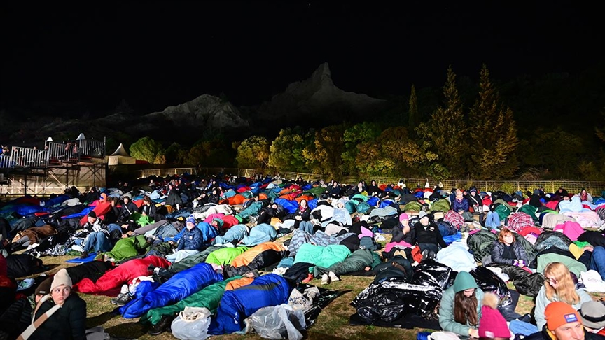 Katılımcılar, uyku tulumları ve battaniyeler içinde tören alanına kurulan dev ekrandan Çanakkale Savaşları’na ilişkin belgeseli izleyerek ayin saatini bekledi.