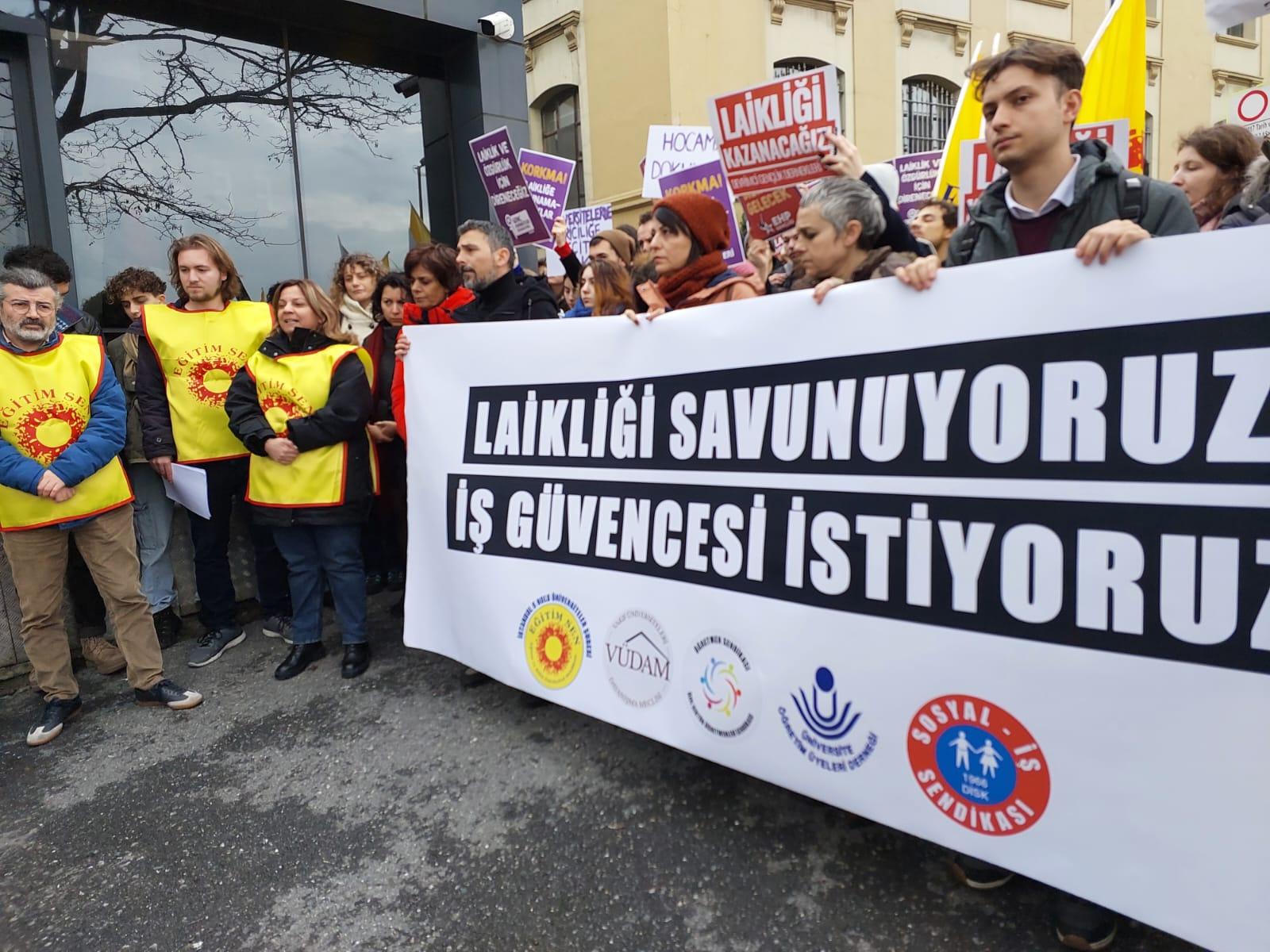 “Onları koruyan TÜGVA üyelerini protokol gibi ağırlamışlardır, bu tutumu şiddetle kınıyoruz. Bugün hakkında açılan soruşturmada savunmasını verecek olan Gizem hocamızın yanında olduğumuzu, Üniversite yönetimlerinin keyfi tutumlarına son vermesi için mücadelemizi sürdüreceğimizi yineliyoruz. Bütün bu gelişmeler bu haliyle dahi üniversitelerde laikliğe ve bilimsel eğitime dair vahim bir tablo ortaya çıkarırken, türlü bahanelerle akademisyenler üzerinde uygulanan baskı ve yaptırımlar akademisyenlerin iş güvencesine dair birçok soruyu da beraberinde getiriyor. Nitekim, kendisinin hedef gösterildiği olaylar yaşanmadan önce Kadir Has Üniversitesi’nde çalışmaya devam edeceğini düşünen Gizem Hoca, şimdi adeta bu olaylar nedeniyle cezalandırılarak işini kaybetme tehlikesiyle karşı karşıya bırakılabiliyor. Gizem Hoca’nın öğrenciliği bittiği bahane edilerek işten çıkarılmak istendiği öğreniyoruz. Üniversitelerin asıl faaliyetlerini yürüten akademisyenlerin kadrolarının esasen kalıcı olması gerektiğini ve türlü bahanelerle işten çıkartılmalarının hukuksuzluğunu vurgulayan birçok yargı kararına rağmen, bu keyfi tutumlarını devam ettiren ve akademisyenleri güvencesiz kadrolara mahkûm eden, iş güvencesini yok sayan tüm üniversitelerin karşısında sesimizi yükletmeye devam edeceğimizi bir kez daha buradan ilan ediyoruz.”