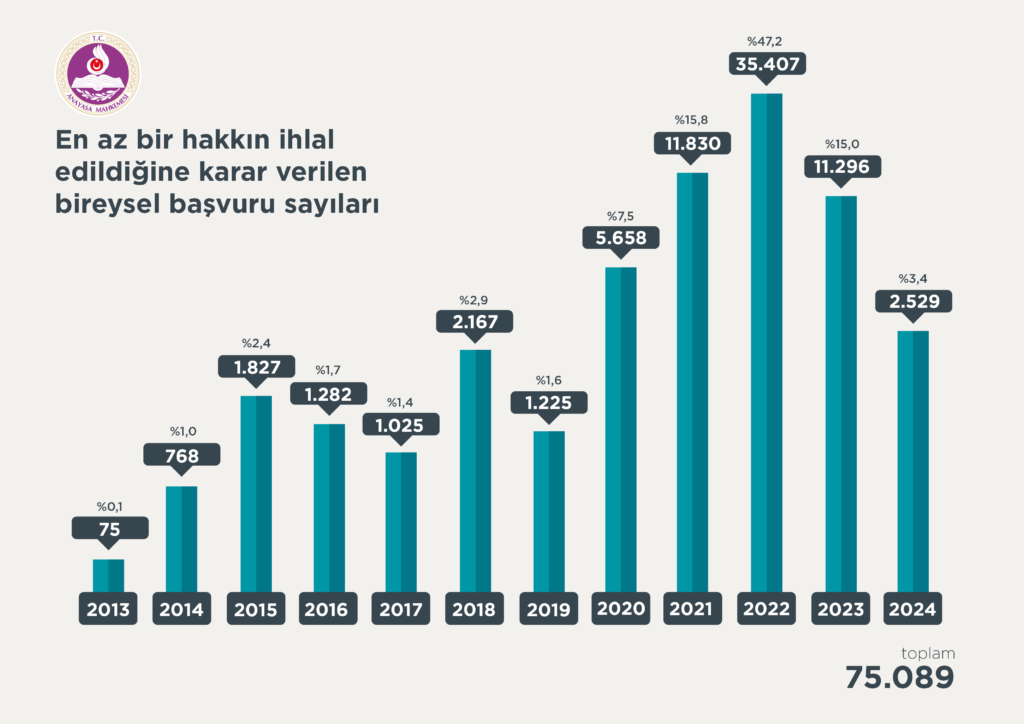 AYM bir veya birden fazla hakkın ihlal edildiğine hükmettiği 76 bin 247 başvurudan 56 bin 443’ünde makul sürede yargılanma, 5 bin 487’sinde adil yargılanma, 4 bin 661’inde mülkiyet, 4 bin 348’inde ifade özgürlüğü 1622’sinde özel hayata ve aile hayatına saygı haklarının ihlal edildiği sonucuna varırken bunu diğer hak ihlali kararları takip etti.