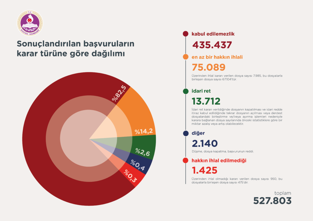 Sonuçlandırılan başvurulardan 435 bin 437’sinde kabul edilemezlik, 75 bin 89’unda en az bir hakkın ihlal edildiği, 13 bin 712’sinde idari ret, 2 bin 140’ında diğer, 1425’inde ise hak ihlali olmadığı kararı verildi.
