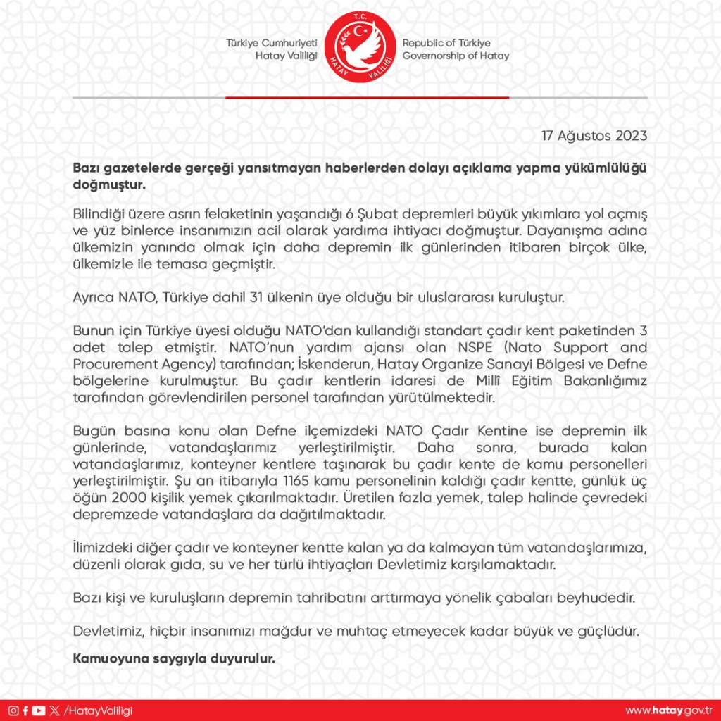 Valilik açıklamasında, NATO’nun bir noktada yemek dağıttığı belirtilip deprem bölgesinin genelinde devletin her türlü ihtiyaçları karşıladığına dikkat çekildi.