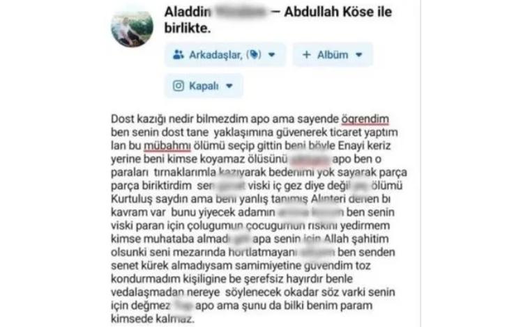 Aladdin Y. ödeme günü akşam saatlerinde Abdullah Köse’nin defnedildiği mezarlığa gitti. Önce mezarın başında konuşan adam bir süre sonra çılgına dönmüşçesine küfürler etti. Ardından Abdullah Köse’nin mezarını biraz kazan Aladdin Y. sosyal medyadan da canlı yayın açtı ve “Kaçmak öyle kolay değil, seni toprağın altında yakacağım” dedi.