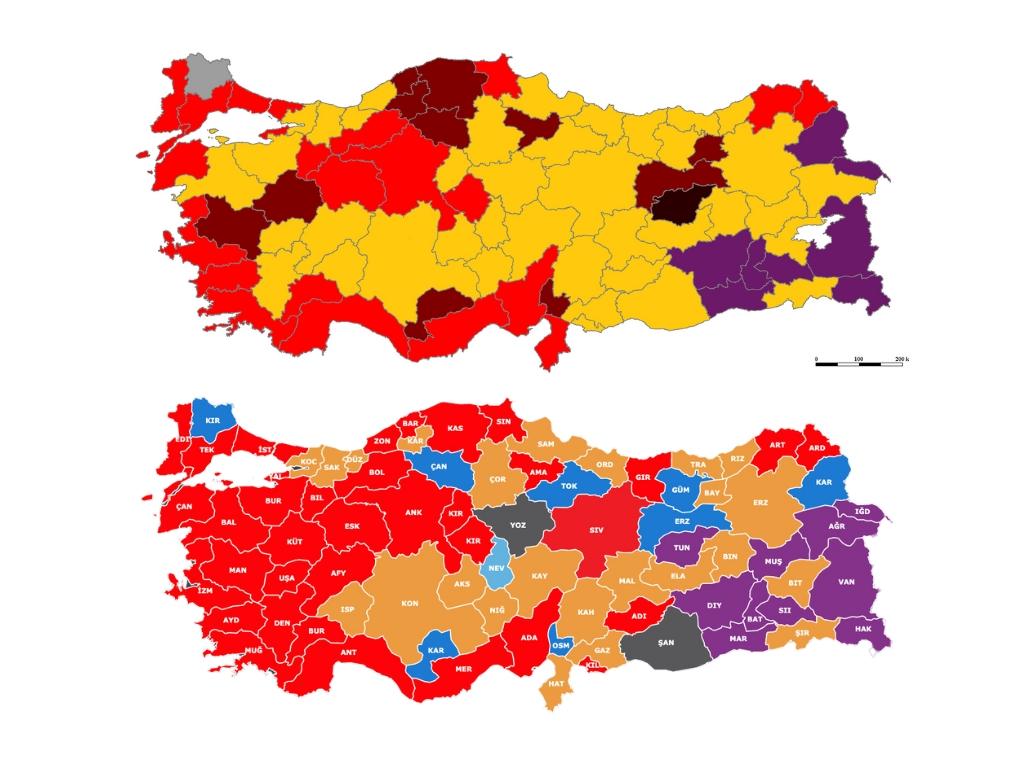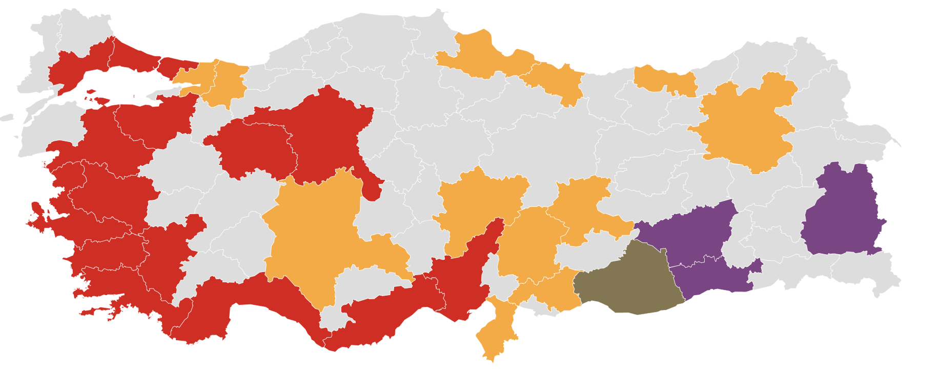 CHP bakımından ise haritanın renkleri 2019’a göre çok daha fazla kırmızıya dönmesi (aşağıda) dikkat çekici. CHP 2019 seçimlerinde yüzde 30,11 oranında oy almıştı.