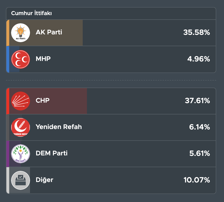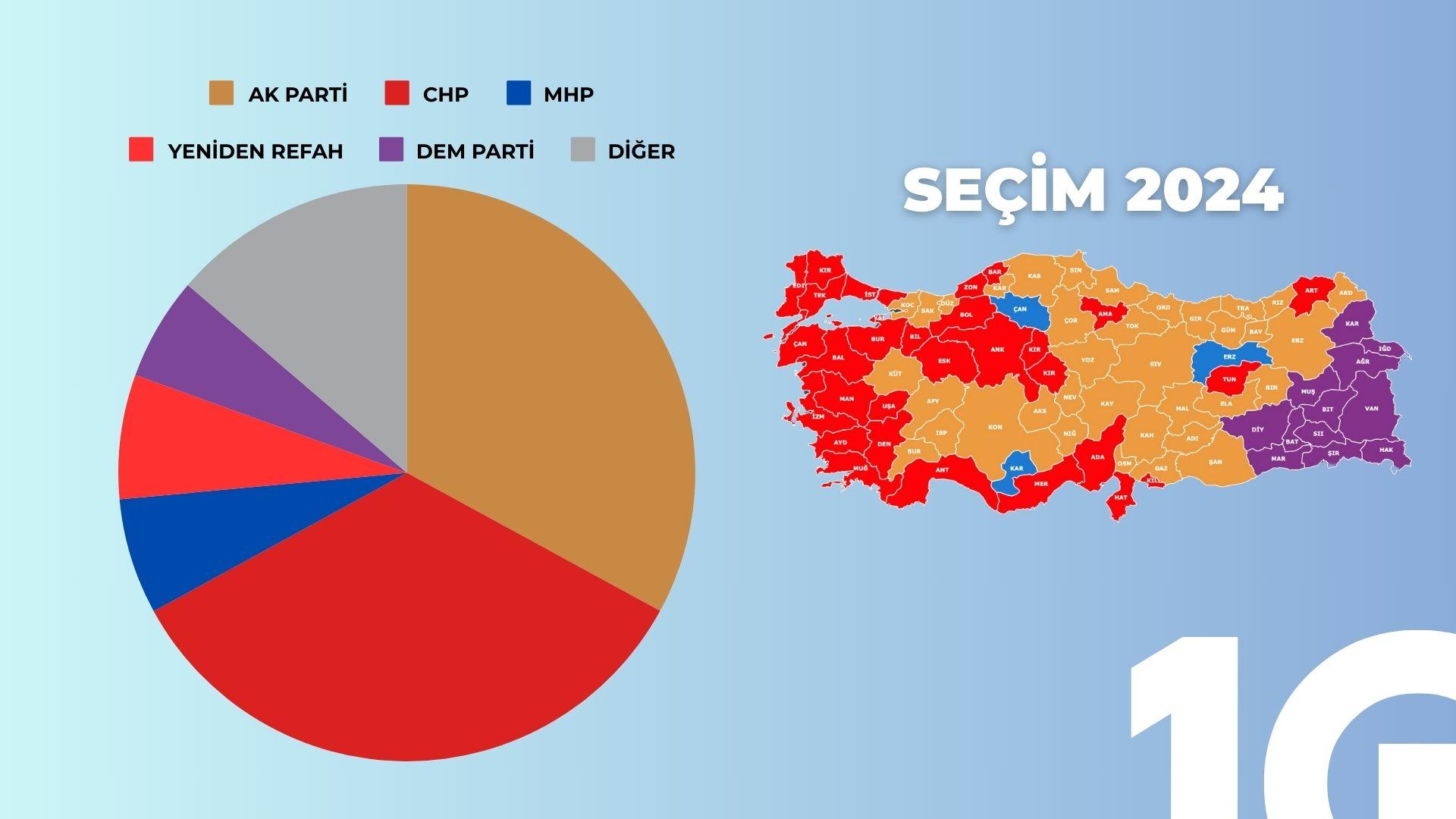30 büyükşehir belediye meclisi ve 51 il genel meclisi oylarının toplamı hesaplandığında CHP’nin seçimden yüzde 34.4 oyla birinci parti olarak çıktığı görülüyor. AK Parti’nin 32,43 ile ikinci olduğunu görüyoruz. Yeniden Refah’ın ise yüzde 7’ye varan oyuyla Türkiye’nin an itibariyle üçüncü partisi olması da bu seçimin ilklerinden biri (ayrıntılı haberi bu linkten okuyabilirsiniz).