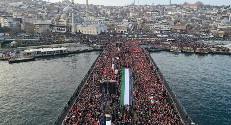 Oysa 1 Ocak’ta aynı köprüde AKP’ye yakın TÜGVA ve 400 sivil toplum kuruluşunun katılımıyla ‘Büyük Filistin Yürüyüşü’ düzenlenmişti.