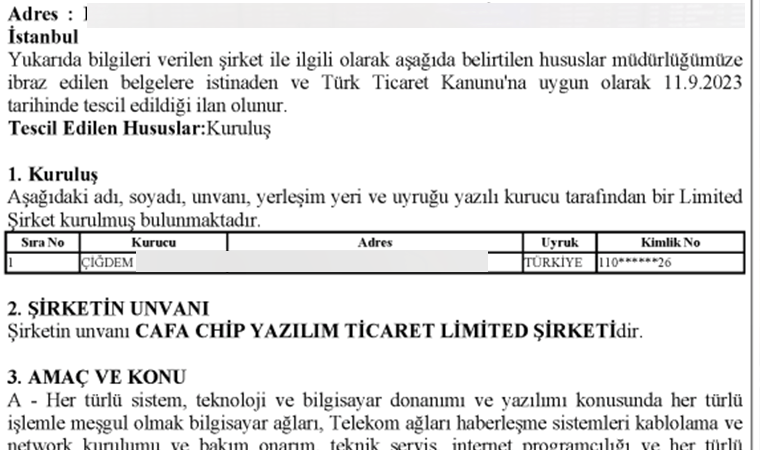 Şirketin tek sahibi Çiğdem İ görülüyor. Ticaret Sicil Gazetesi’nde şirketin amacı hakkında ise şöyle yazılıyor: