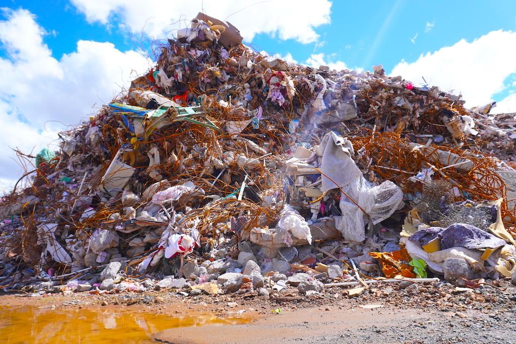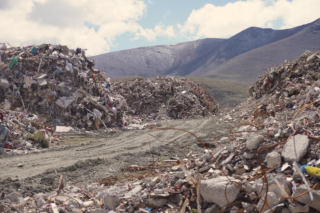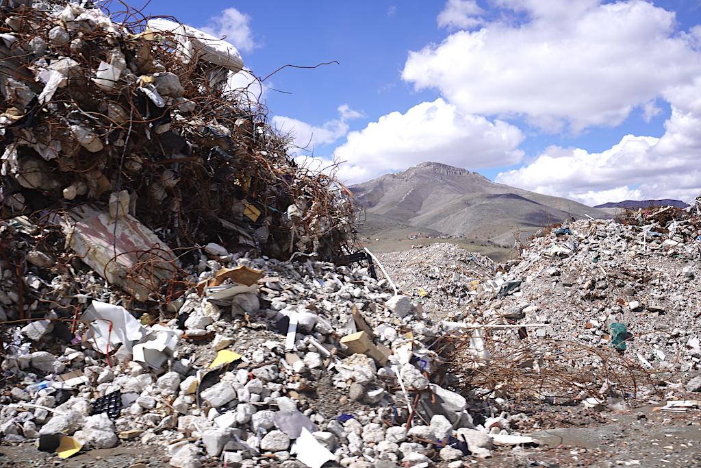 Metrelerce yüksekliğe ulaşan ayrıştırılmayan molozların arkasında Beydağı yükseliyor.