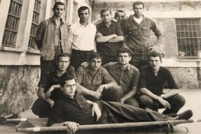 Ayaktakiler (Soldan sağa) Kor Koçalak, Hüseyin İnan, Recep Sakın, Mustafa Çubuk, Deniz Gezmiş. Oturanlar (Soldan sağa) Mete Ertekin, Yusuf Arslan, Ercan Öztürk, Semih Orcan, sedyede Mustafa Yalçıner | Mamak Cezaevi 1971 – Mustafa Yalçıner’in arşivinden.